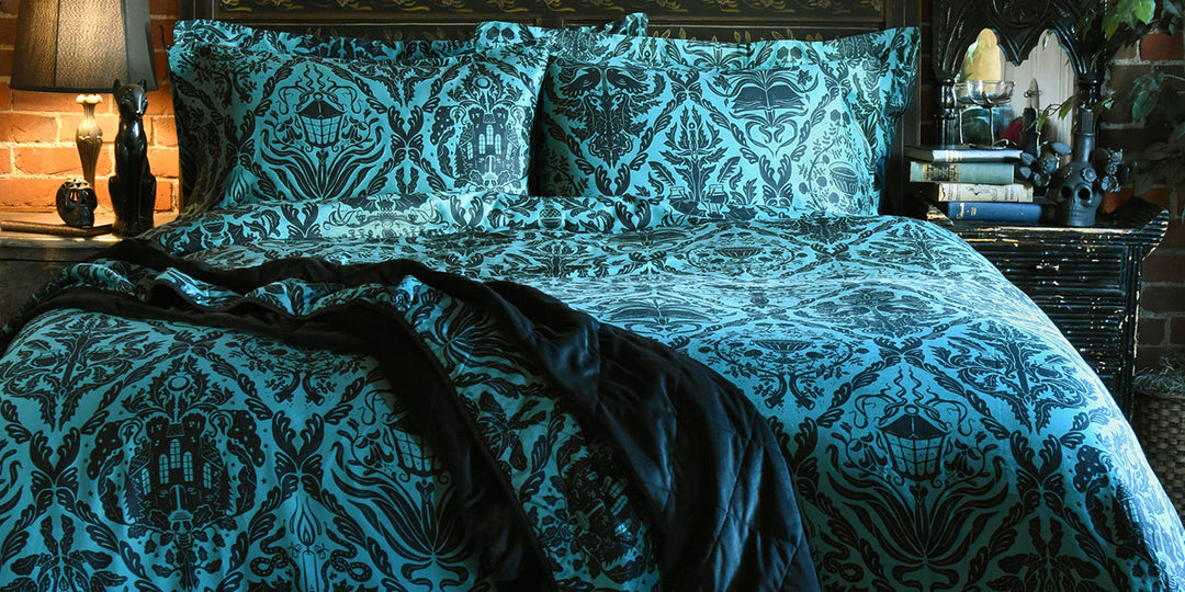 Night Garden Harvest botanical bedding on a bed. Features florals, serpents, and spiders for a nature inspired bedroom.