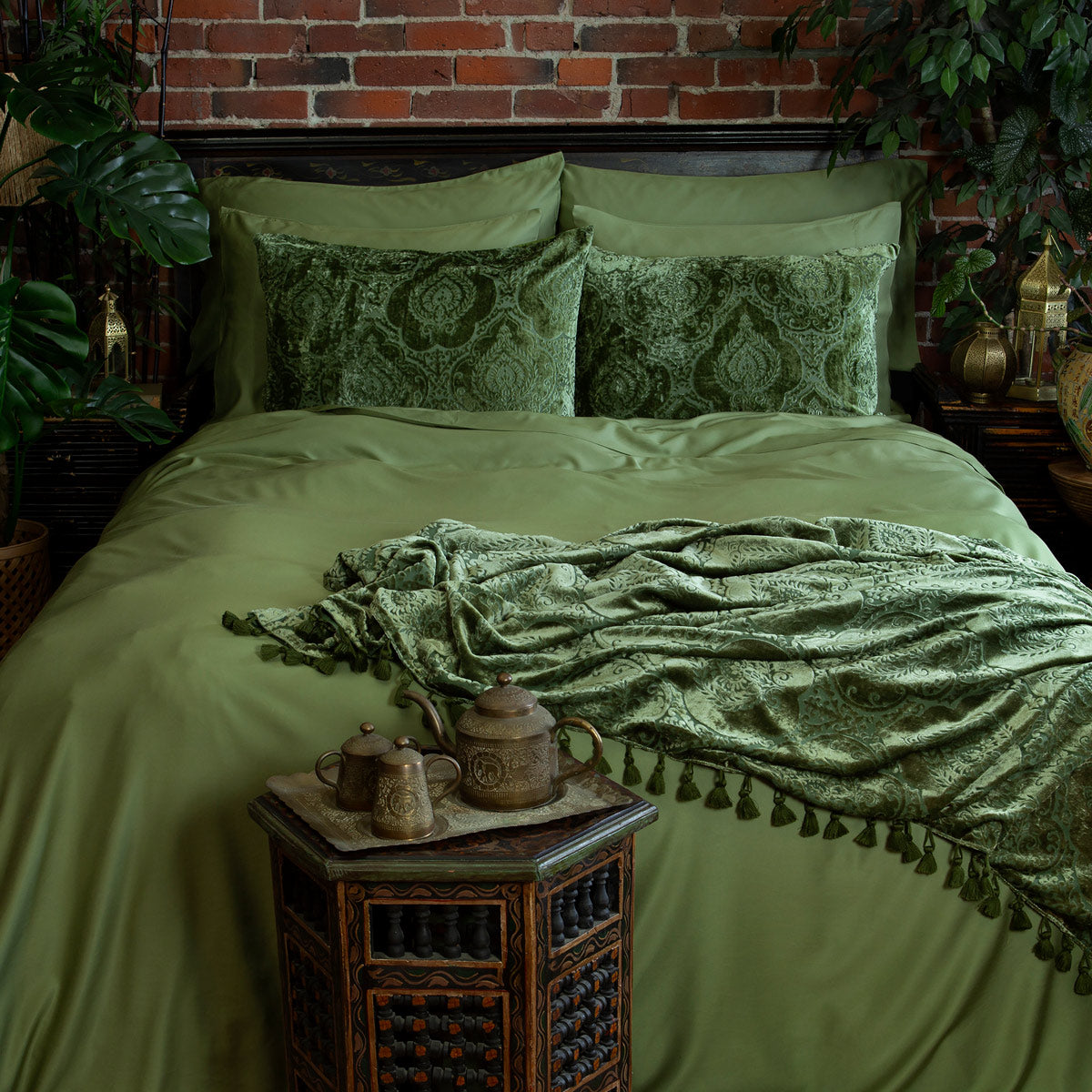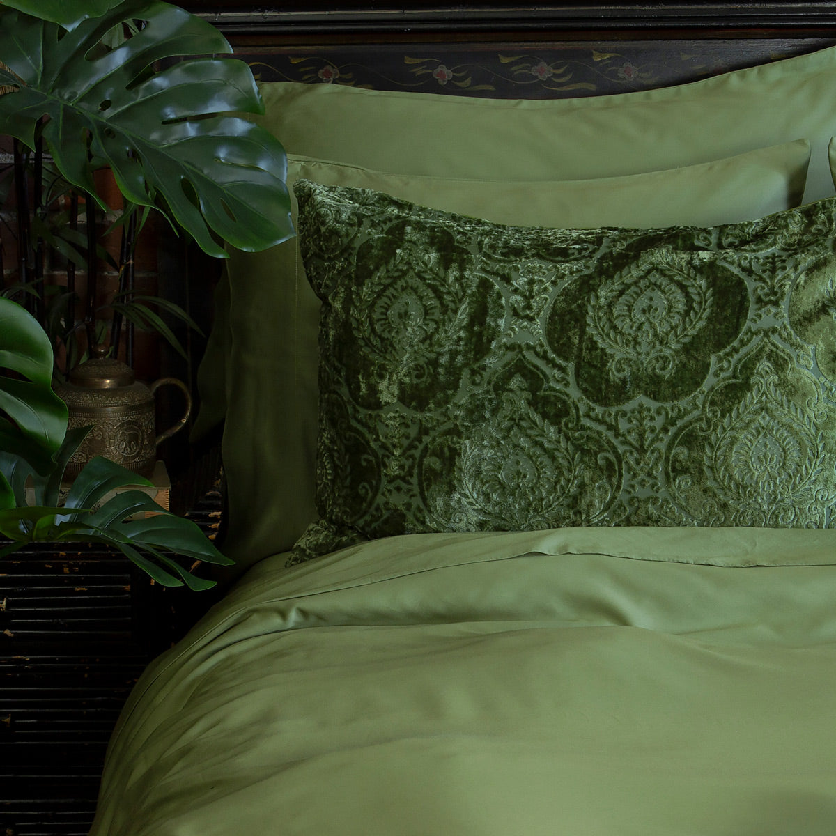 Moss green bamboo bedding with a relaxed, cozy feel.