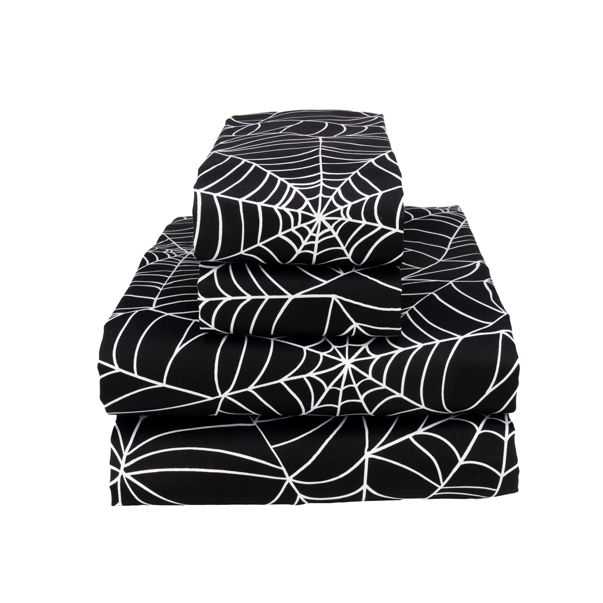 Spin a web of comfort in your bed with the Spider Web Bedding collection. The jet black sheets are crawling with bone white spider webs. Made of 100% cotton, they are woven to be as soft as spiders silk.Â