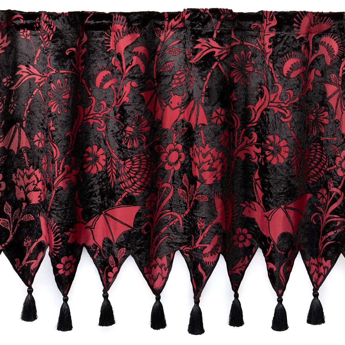 Unleash the bats! Add that perfect gothic touch to your windows with our Velvet Bats Curtains in Red and Black. This classic color combination meets embellished bats and botanical motifs for an elegant look that speaks to your dark side.