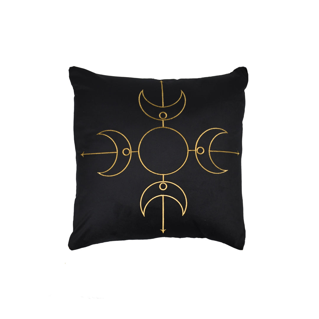 Luxurious throw pillow with Moon Phase design embroidered on Black Velvet..