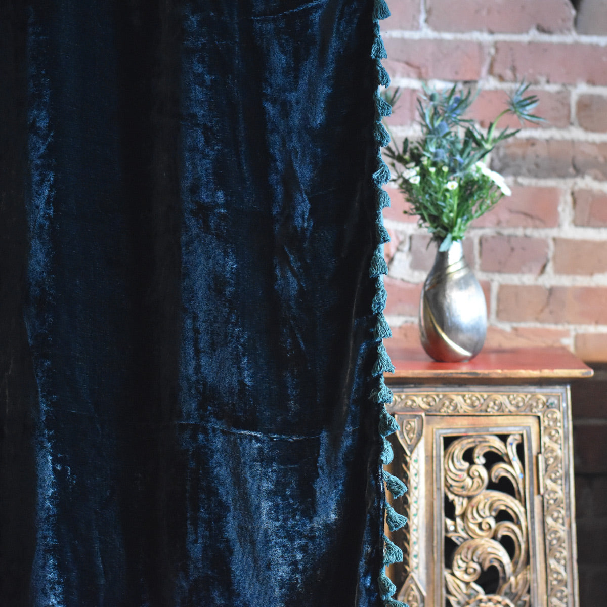 Dark green velvet curtain with tassels against a window.