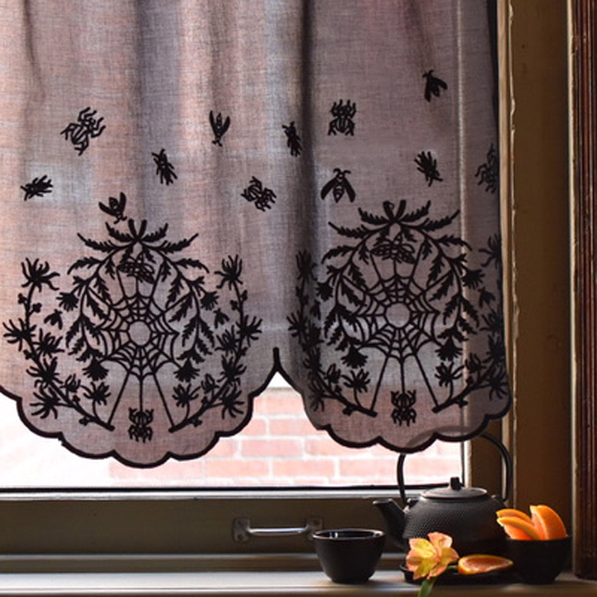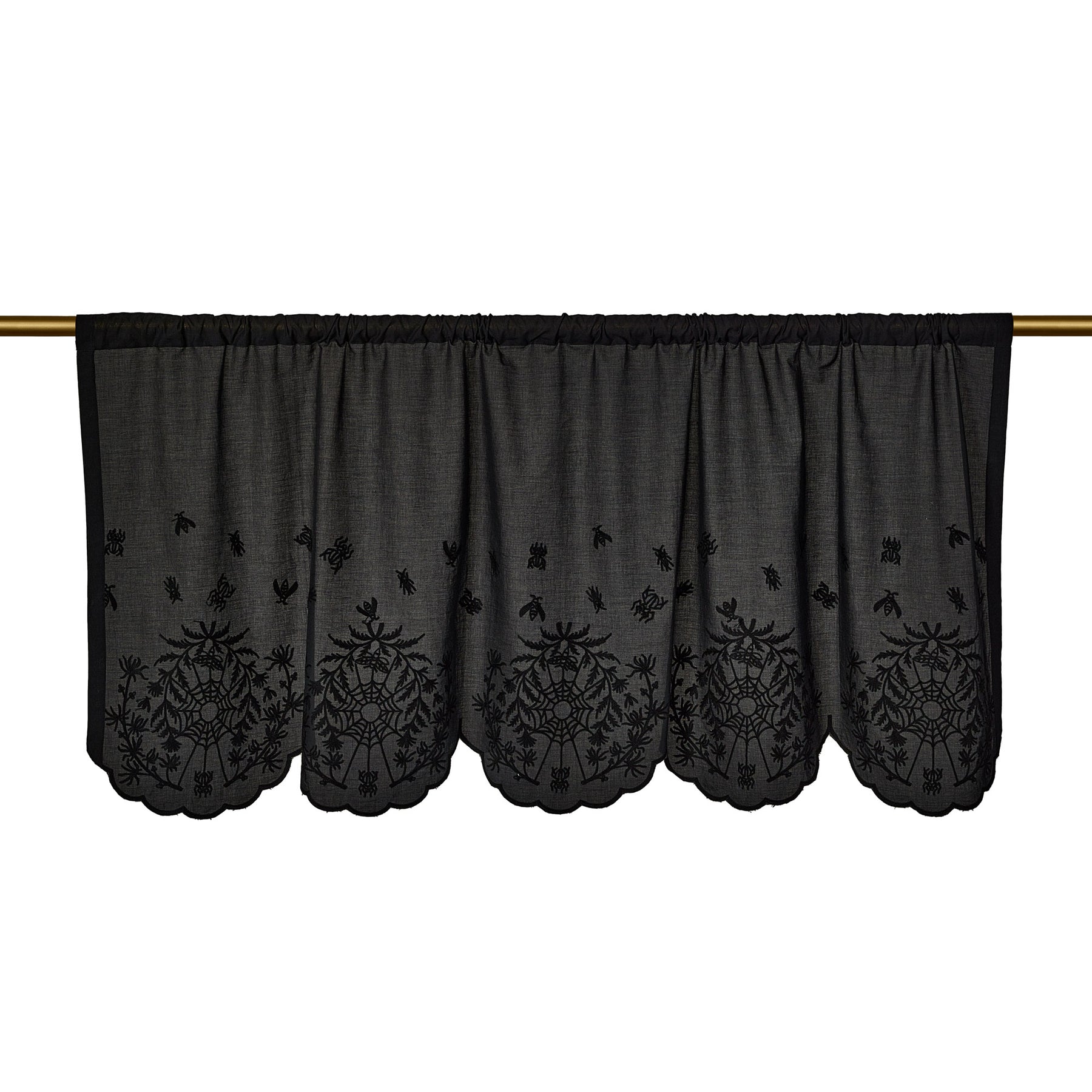 This Spider Web Lace Valance adds a classic and elegant touch to any window. The classic black lace effect is made of 100% cotton and has an intricate cross-stitch spider web pattern that brings a unique character to any room. Makes a great addition to any spooky home.