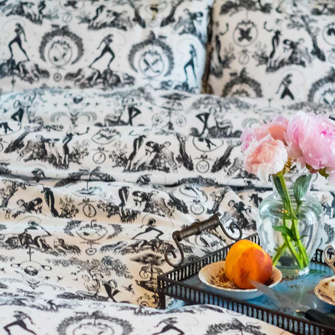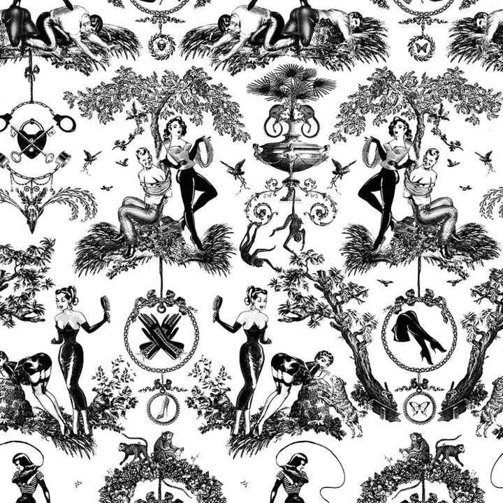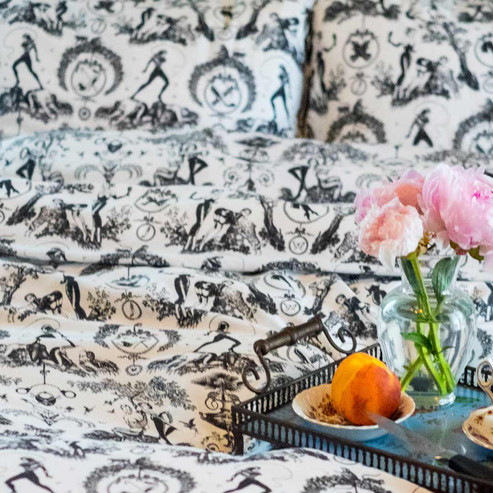 Take a walk on the wild side. Fetish al Fresco Toile is a pastoral landscape of colonial scenes that will dominate your dreams. At first glance this Victorian toile is a traditional classic. But look closer, you'll see the scene is actually at her beck and toile. If you like to play, then it's time to beg for this comforter on your bed.