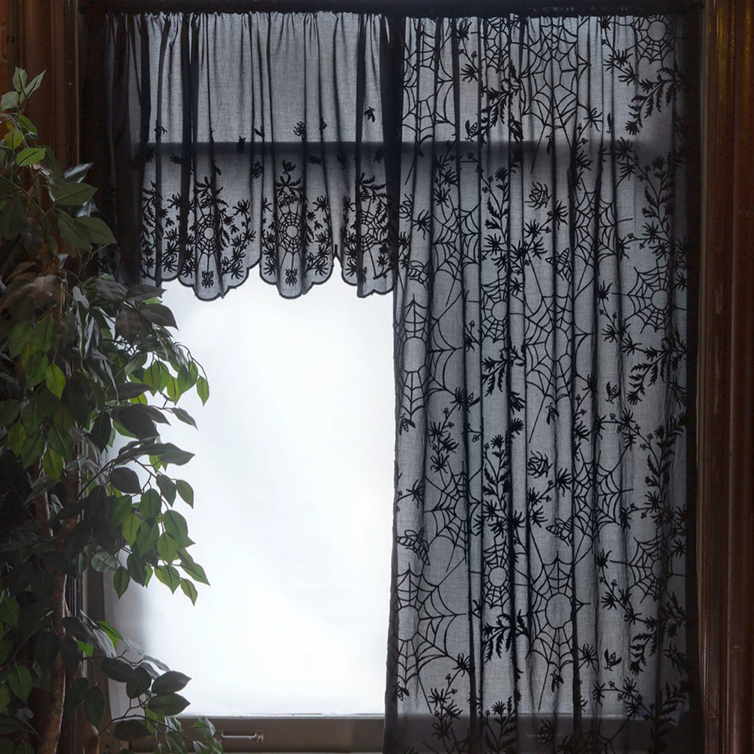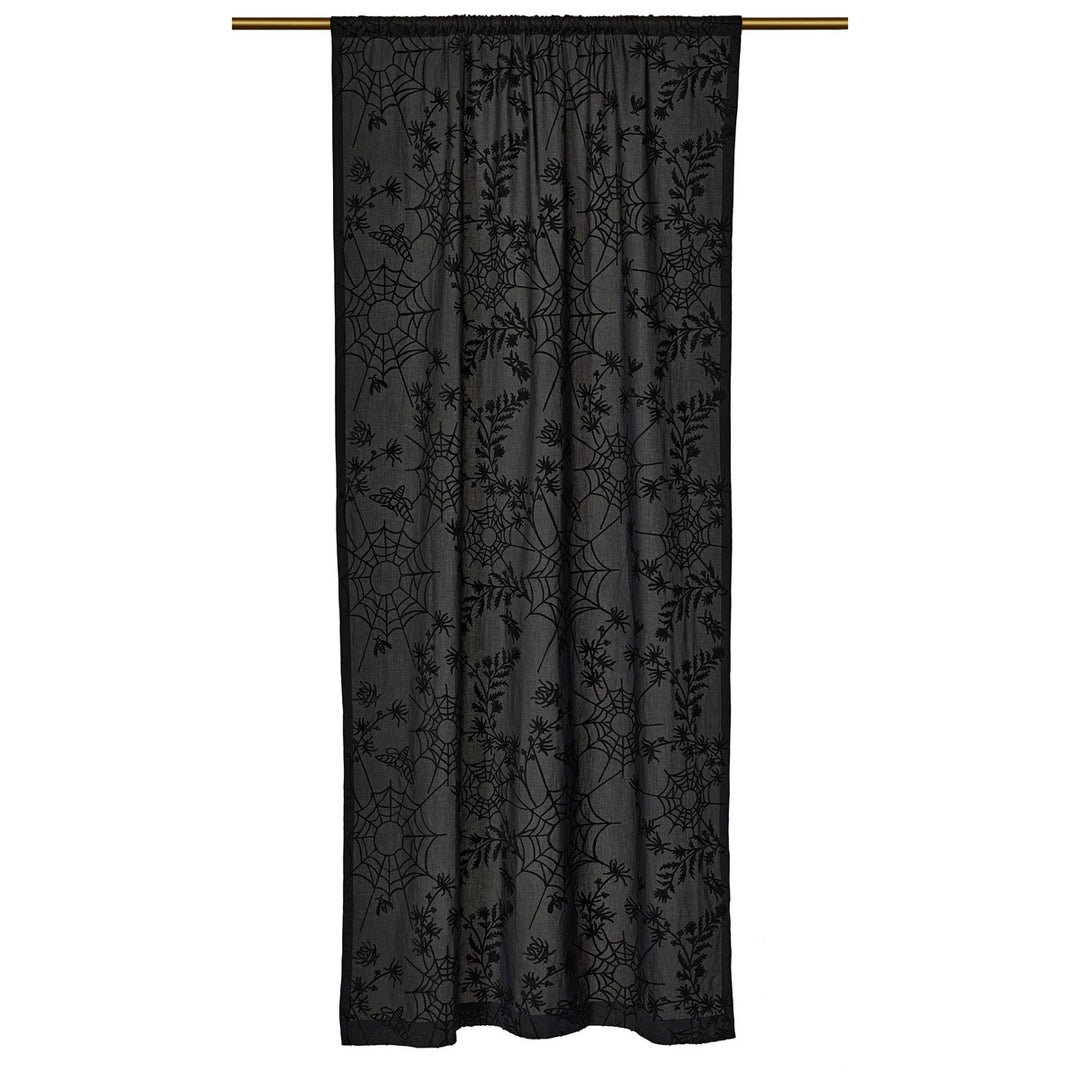 Black spider web lace embroidered curtain with spider web and insect detailing.