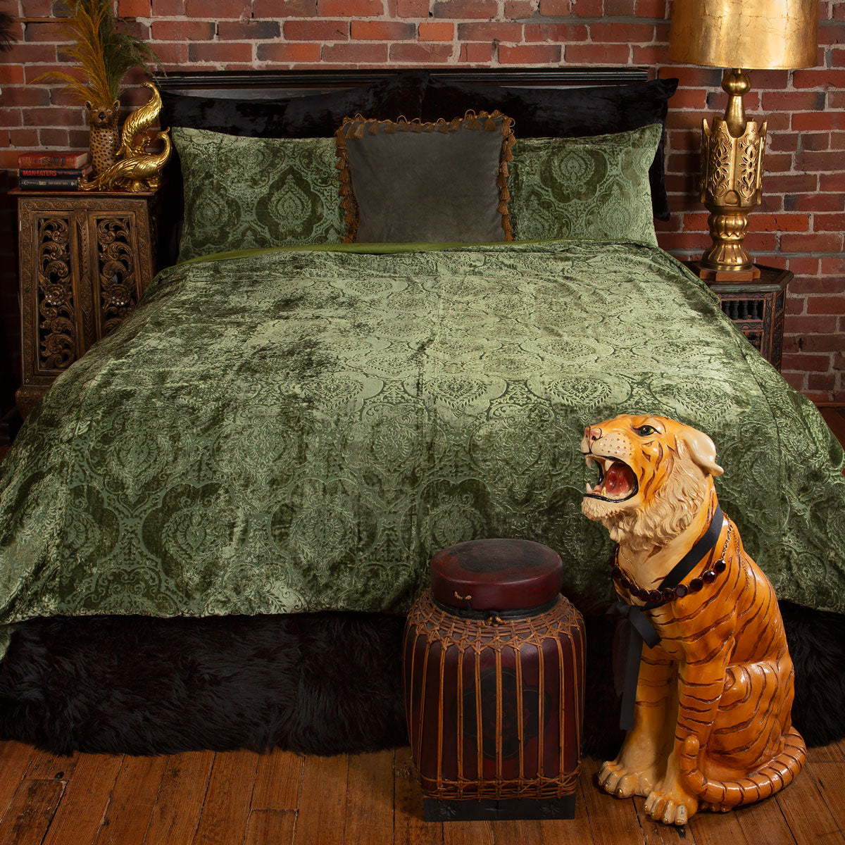 Cat lying on moss green velvet damask bedding by Sin in Linen.